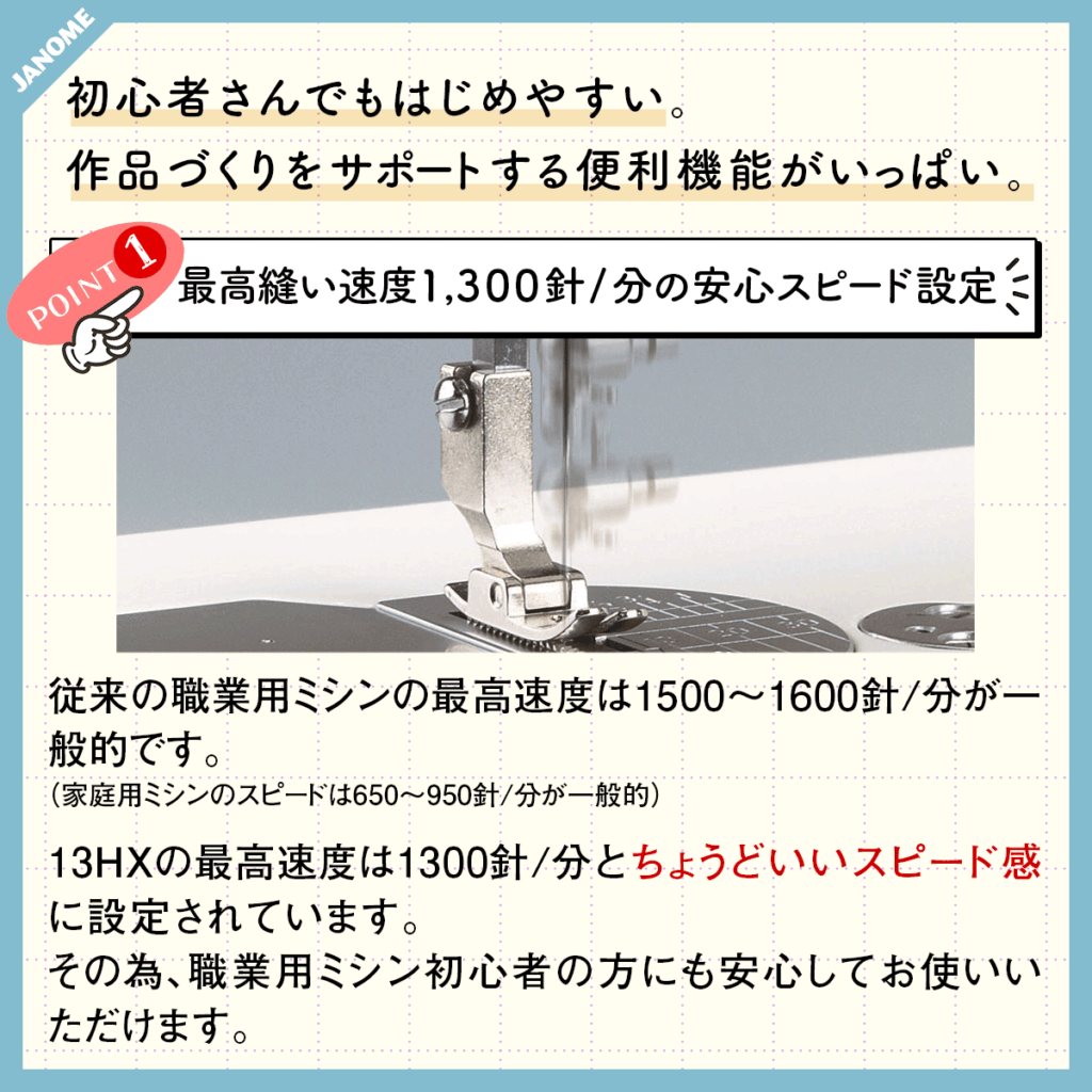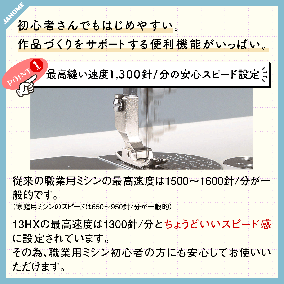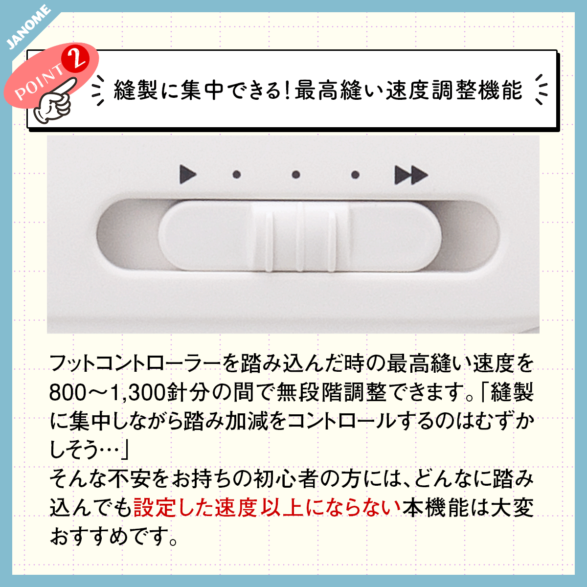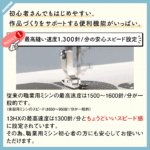 - 「最高縫い速度1,300針/分」の安心スピード設定