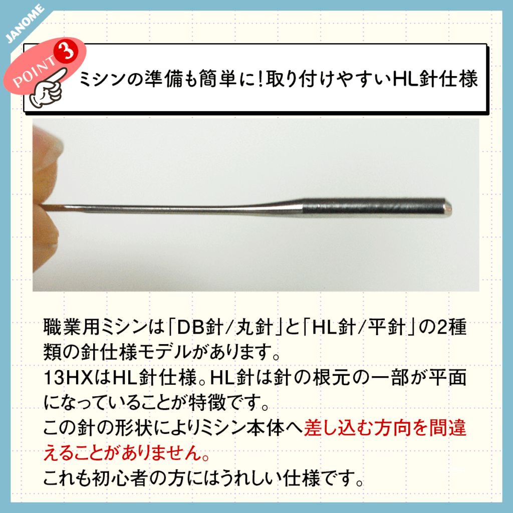 - 針を正確な向きに取り付けられる「HL針(平針)仕様」