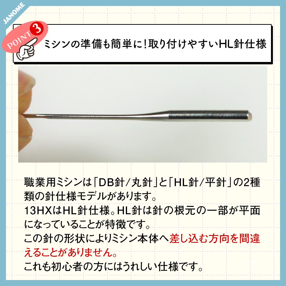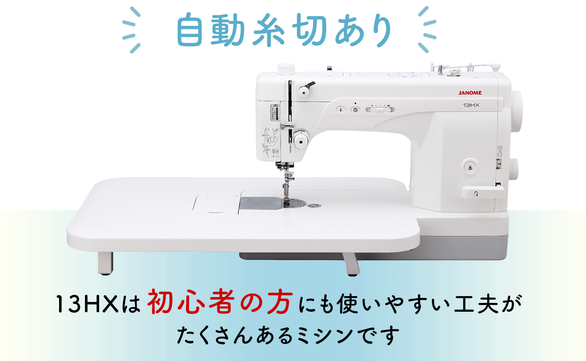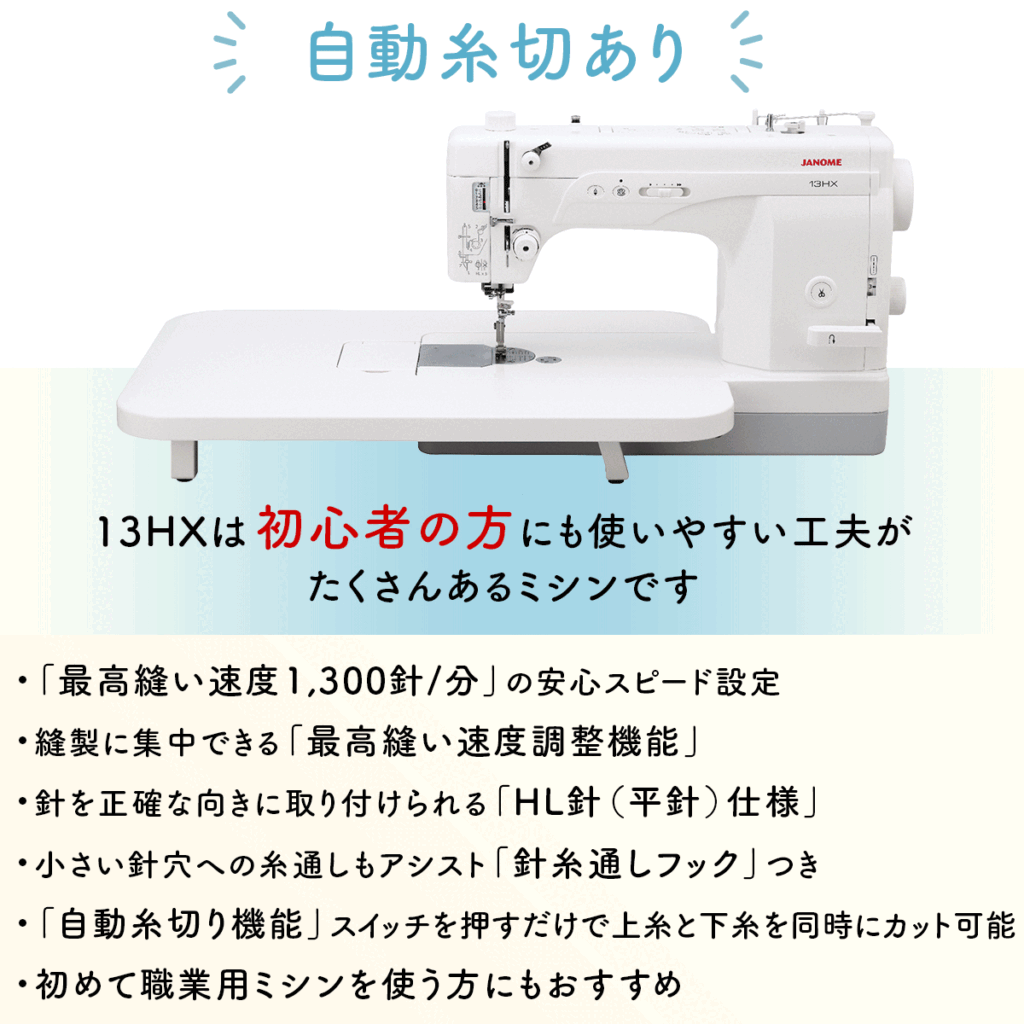 トップページ > 商品 > 用途で探す > 厚い生地を縫いたい > ジャノメ 職業用ミシン [13HX 自動糸切あり] JANOME 蛇の目 HL針仕様 平針仕様 針糸通し機能あり スピード調整つまみあり