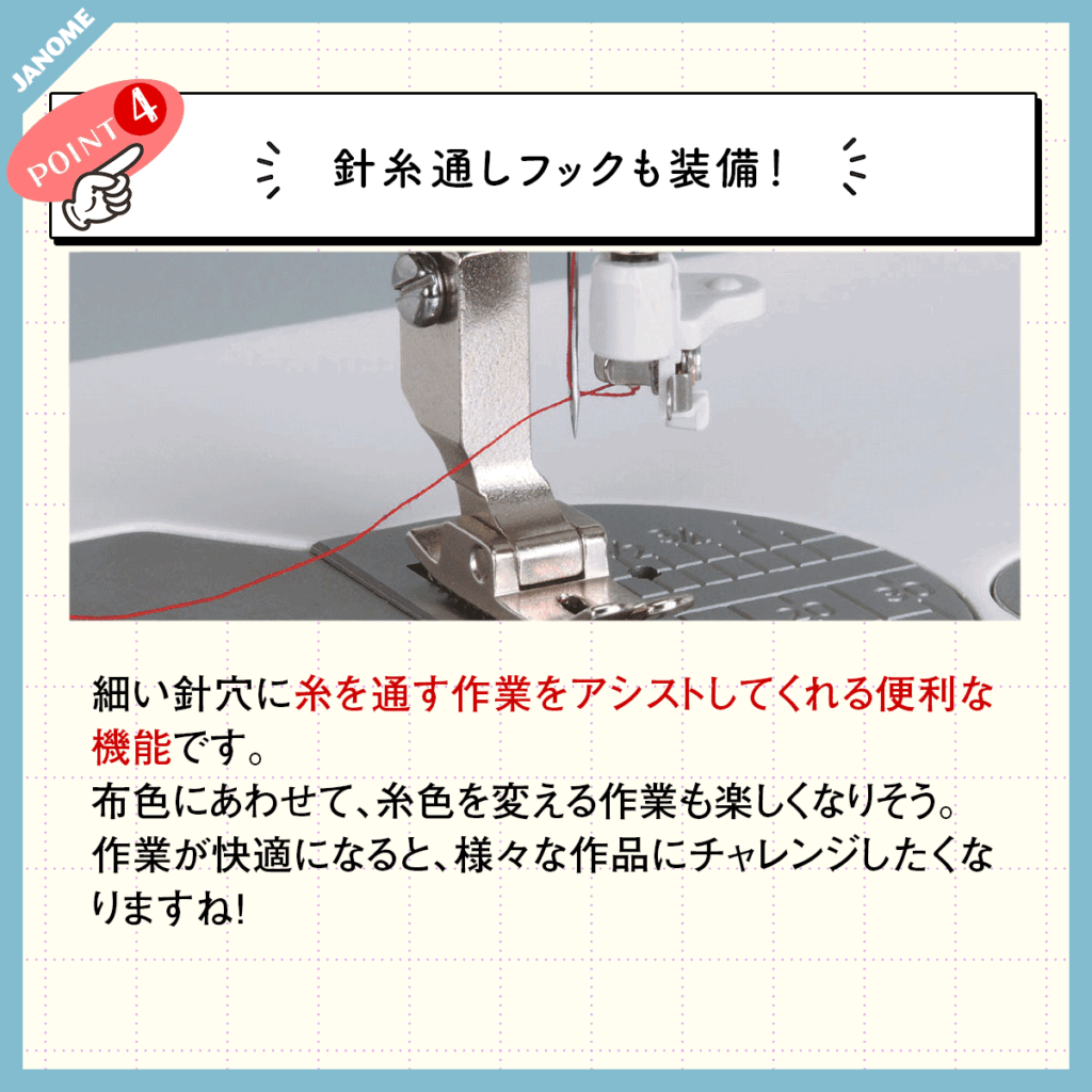 - 小さい針穴への糸通しもアシスト「針糸通しフック」つき