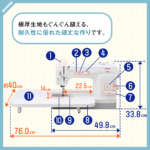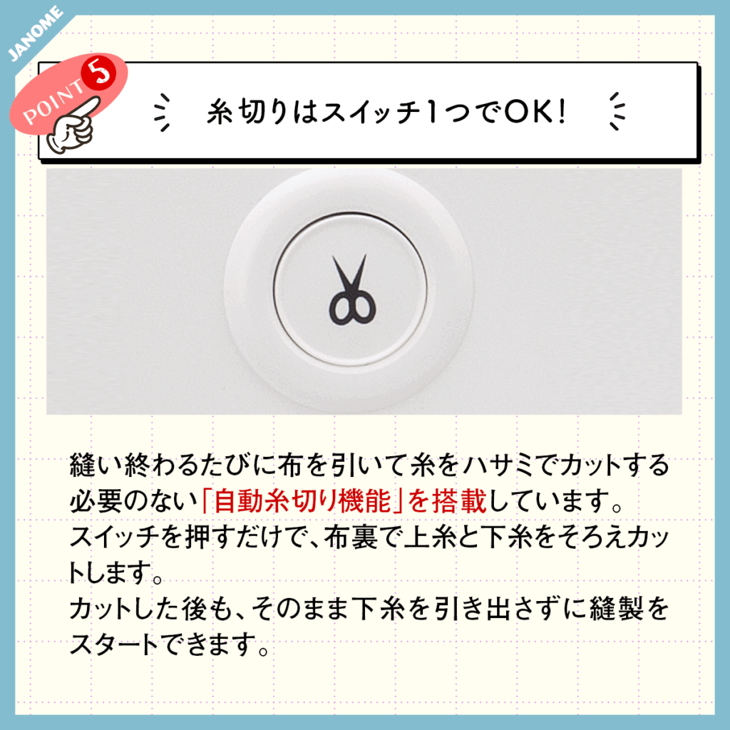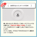 - 「自動糸切り機能」スイッチを押すだけで上糸と下糸を同時にカット可能