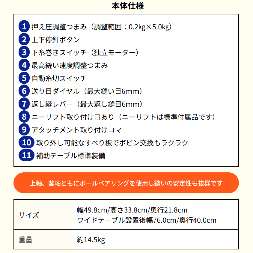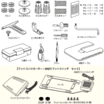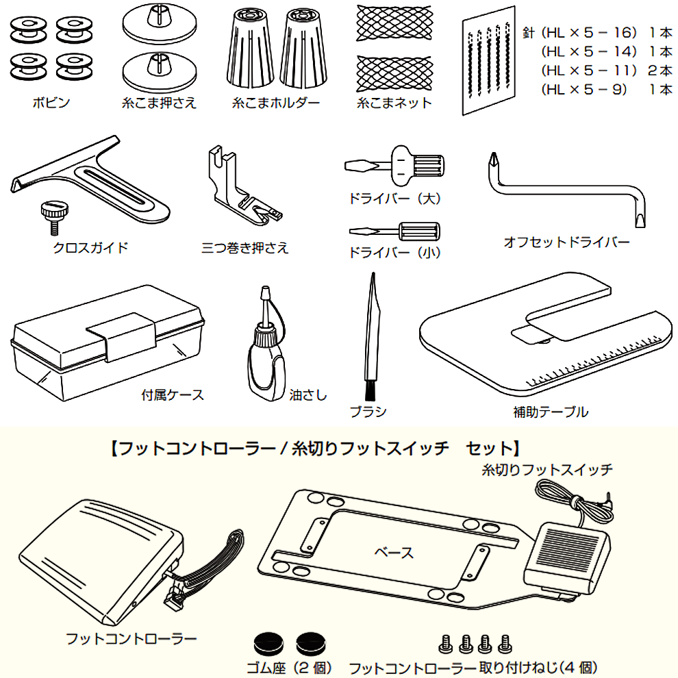 基本押え(本体に設置されています)/三巻押え/ボビン4個/付属ケース/針セット(#16/1・#14/1・#11/2・#9/1)/ドライバー2本/オフセットドライバー/クロスガイド/油さし/ニーリフト/糸コマ押え/糸コマネット/糸コマホルダー/ブラシ/取扱説明書/ダストカバー/補助テーブル/大型フットコントローラー/糸切スイッチユニット/電源コード/ニーリフト/取扱説明書