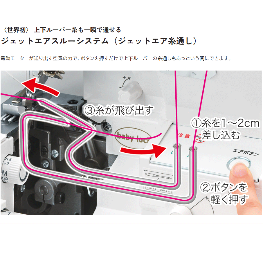 下糸準備の段階で2本同時に糸を通してくれる世界初!ジェットエアシステムはベビーロック独自のエアスルーシステムを更に進化させた大変便利な機能となります。