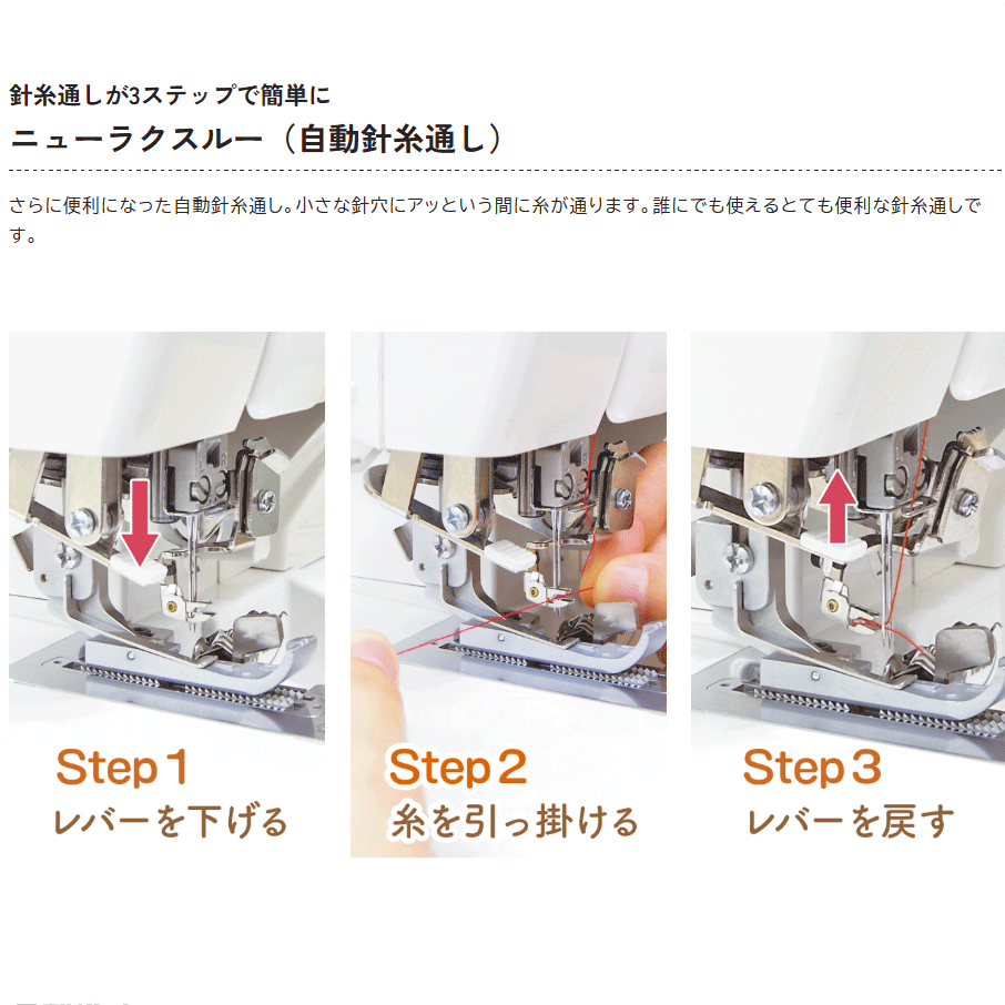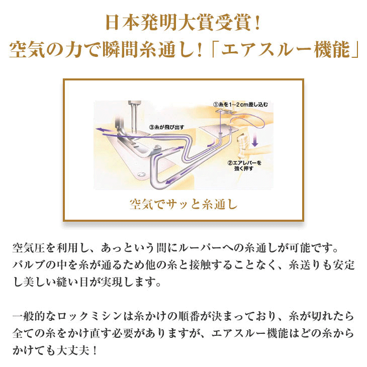 電動モーターが送り出す空気により、ボタンを押すだけで糸が通ります。めんどうだった上下ルーパーの糸通しが上下同時にあっという間にできる世界初のジェットエア糸通し機能です。(特許出願中)