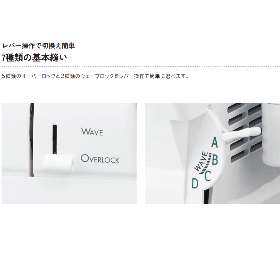 ウェーブロックできる波状の糸目は縫い目自体がデザインとなり使用する人感性を大きく広げてくれる、通常のロックミシンでは出来ない独特の機能です。