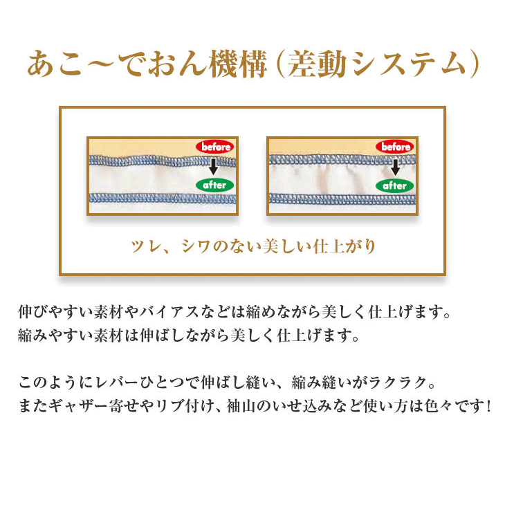 レバーひとつで伸ばし縫い、縮み縫いがラクラク。伸縮素材をツレ、しわの無い美しいシルエットに仕上げます。また、ギャザー寄せやリブ付けもカンタン。ほかにも袖山のいせ込み、スカートのヘムなど、使い方いろいろです。(特許番号 第3386487号)
