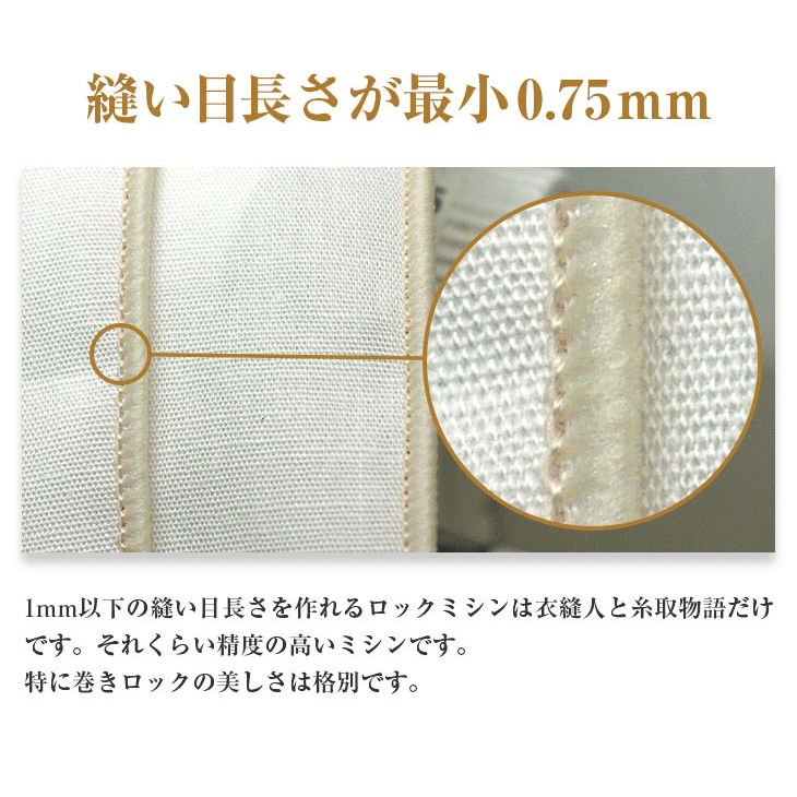 これまで送り目最小1mmだったものを0.75?まで小さくすることにより、巻き縫いの縫い目がより細かく仕上がるようになります。