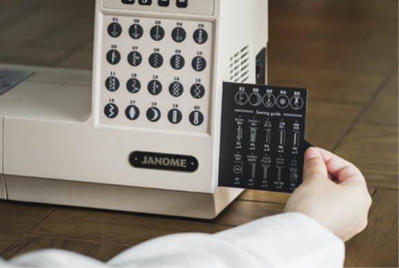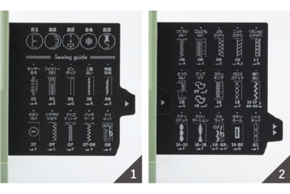 スライド式のパネルにはダイレクト選択ボタンに含まれない5ステッチがプリントされています。また、「Sewing guide」には、それぞれのぬい模様の作品への活かし方をわかりやすくイラストにして、作品づくりをサポートしています。