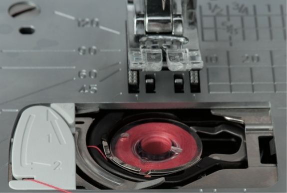 ボビンを入れて、矢印に沿って糸を通すだけで、ぬい始めの糸を引き上げる手間がなくなります。