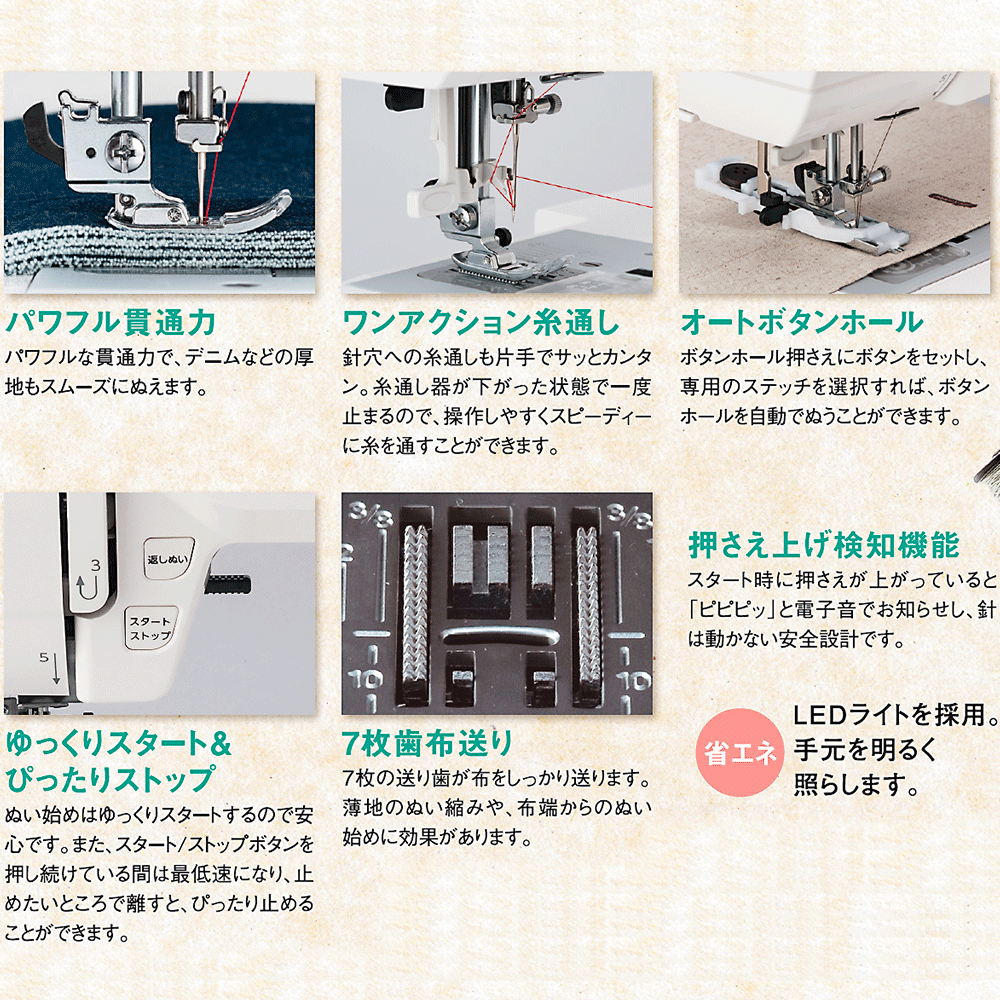 | うっかり押さえを下げずに縫おうとするとエラー音でお知らせしてくれます | 送り歯の枚数 | 7枚 | 7枚 | 7枚 | 7枚 | 7枚 | 7枚 |