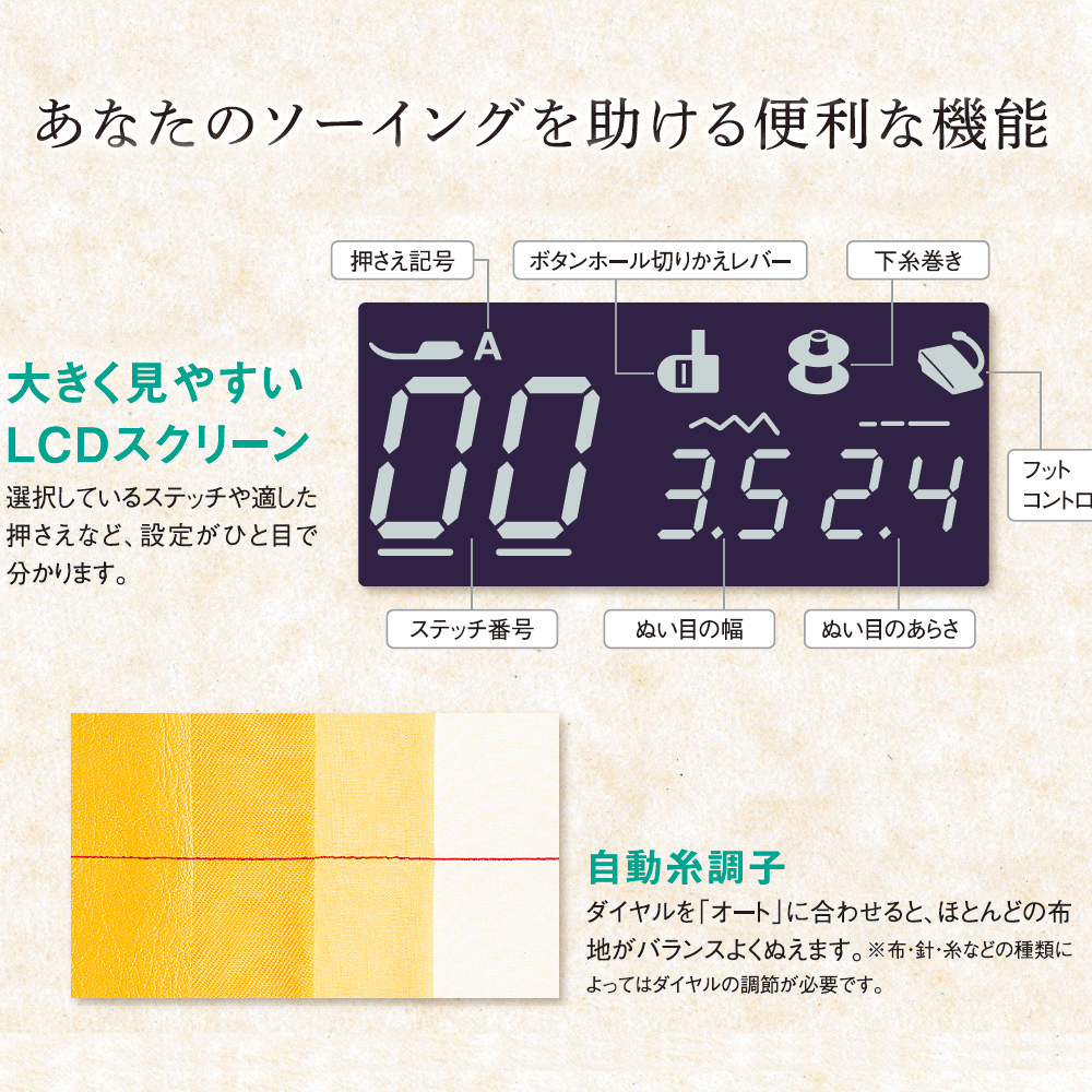 大事な自動糸調子はそのままに、本体の形状・耐久面を全面的に見直し、ミシン初心者でもより楽しくより使いやすいミシンになっています。