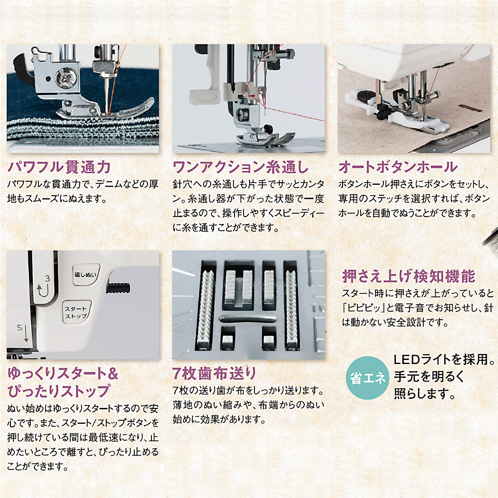 | うっかり押さえを下げずに縫おうとするとエラー音でお知らせしてくれます | 送り歯の枚数 | 7枚 | 7枚 | 7枚 | 7枚 | 7枚 | 7枚 |