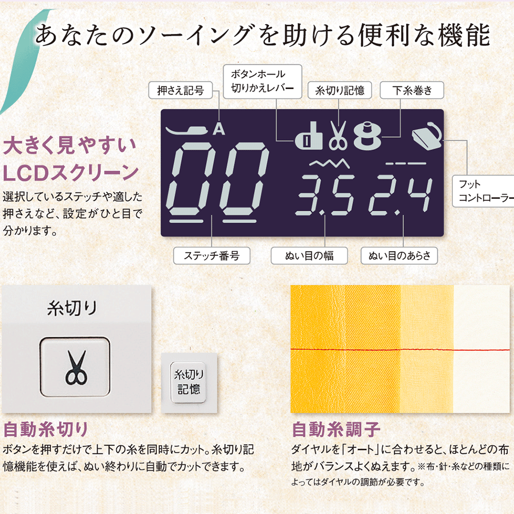 自動糸調子の機種は、ミシンのスピード、布に対して安定して糸を送りますので、糸調子に不安のあるお客様には特にお奨めです。