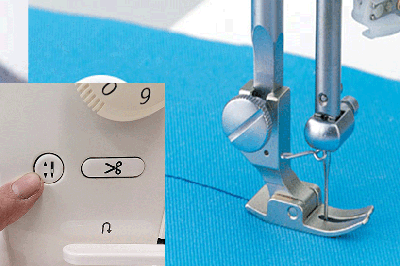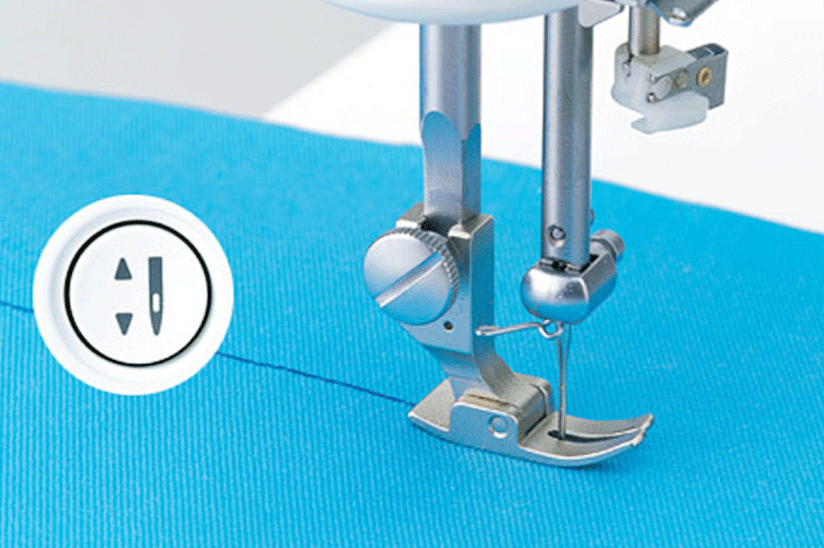 ・ミシンを止めた時には必ず下位置で針が停止、針マークのボタンを1回押すことで針を上や下位置に変更可能、一針進みたい時は2回ボタンを押すと停止します。
