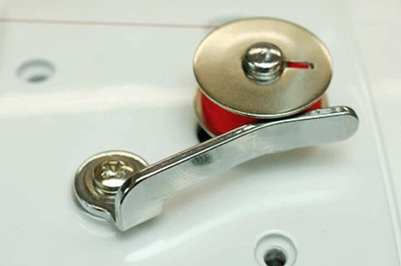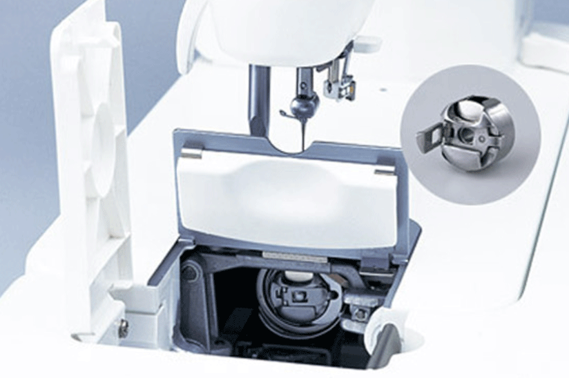 ボビンケースを使う工業用垂直全回転釜ですので、糸の太さに関係なく上糸、下糸の糸調子を思い通りに調節できます。 ボビンケースは倒立タイプでつまみが起こせますので持ちやすく、下糸の交換も楽にできます。