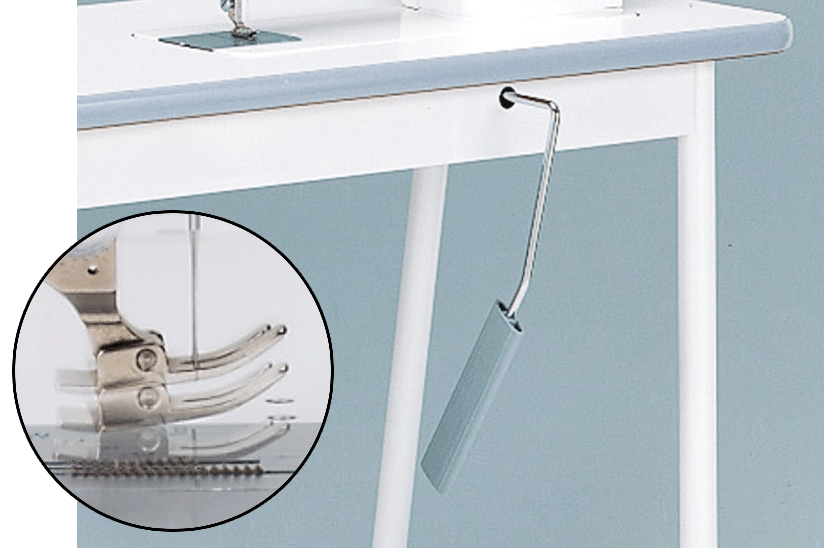 通常、押さえをあげた場合は7mmまでしか上がりませんが、ニーリフターを使うことで12mmまで、 押さえの上げ下げが可能となります。 常時、両手が使えますので大物ぬいの切りまわしをする際、便利です。