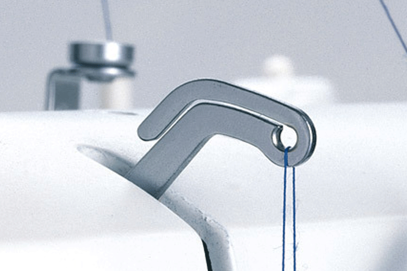 HL/HA針(平針)仕様は家庭用ミシン同様に自動針穴しは装備、糸通しレバーを下げ、ミシン糸をフックに引っ掛けることで針穴に糸が通ります。