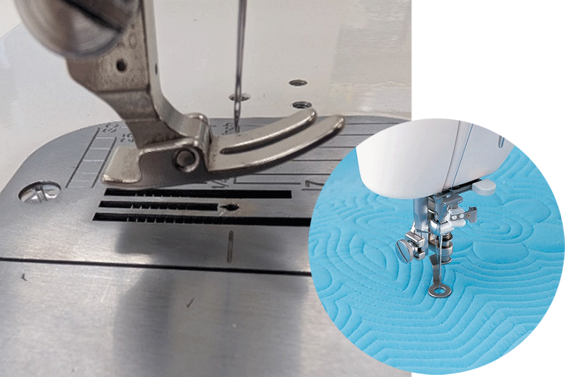 送り歯がつまみ操作でアップ・ダウン。キルトのフリーモーションやフリー刺しゅうも自由自在。