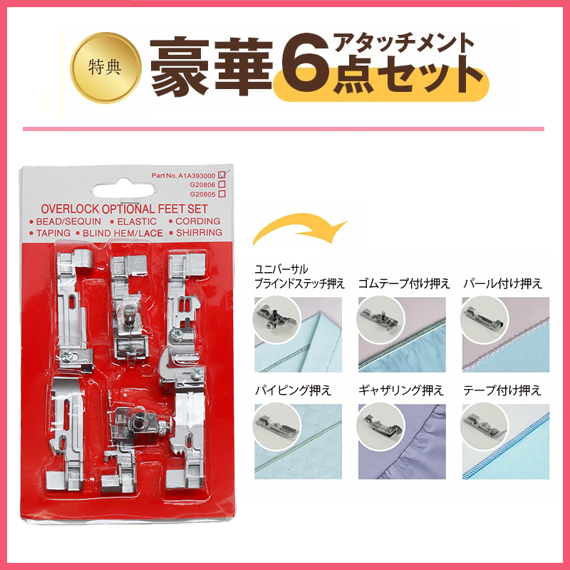 ピンセット、六角ドライバー、ブラシ、針糸通し、マイナスドライバー、太糸用糸案内、2本針切替アタッチメント、糸コマ押え(×4)、糸巻振れ止め(×4)、ネット(×4)上メス、針セット、布屑受け箱、頭部カバー、フットコントローラー、DVD
