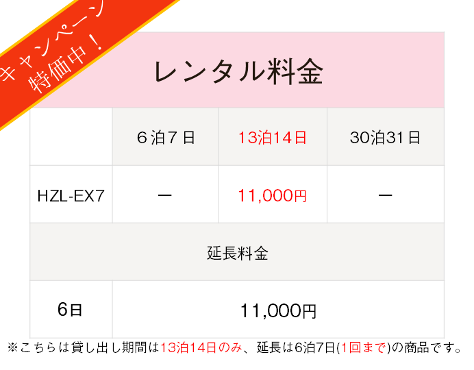 | 貸し出し単位 | 6泊7日(キャンペーンなどを除き、1日単位での貸出は承っておりません) |